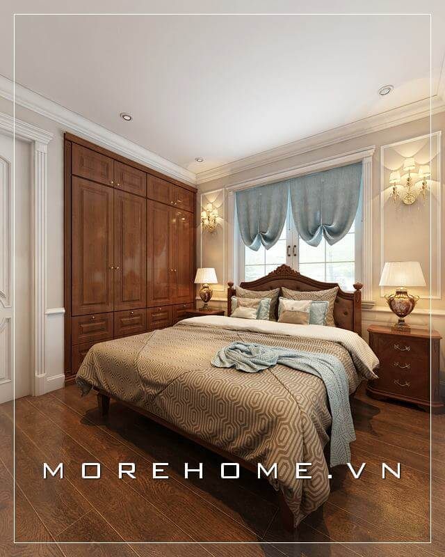 Thiết kế phòng ngủ chung cư phong cách tân cổ điển sang trọng, nội thất gỗ óc chó màu nâu ấn tượng tạo không gian nghỉ ngơi thêm phần ấm cúng