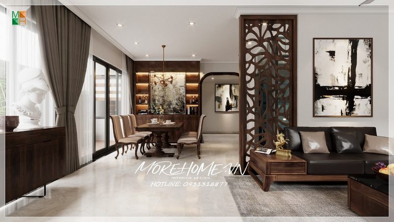 Gợi ý thiết kế phòng khách mở thông với phòng bếp để thuận tiện cho việc sinh hoạt của các thành viên trong gia đình