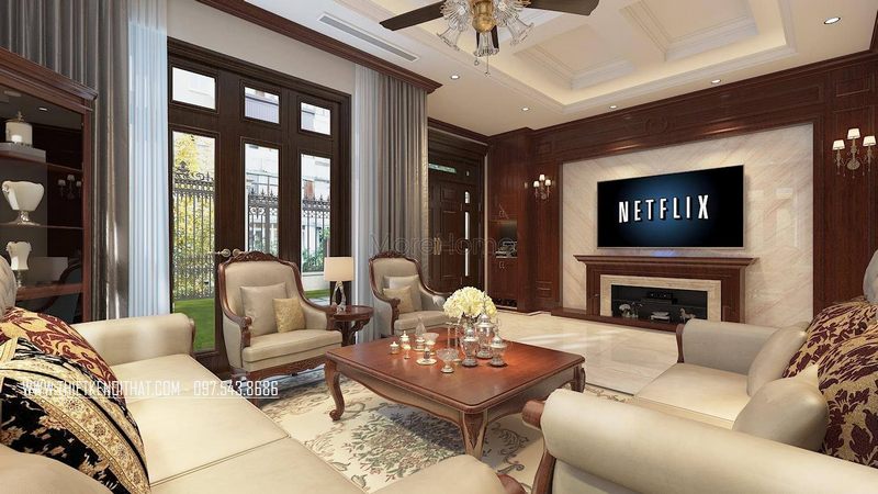 Không gian phòng khách trong biệt thự nhà phố được thêm một phần sang trọng với thiết kế sofa gỗ óc chó tân cổ điển, kiểu dáng văng đôi tiện lợi kết hợp với ghế đơn nhung để tạo nên một cảnh ấn tượng.
