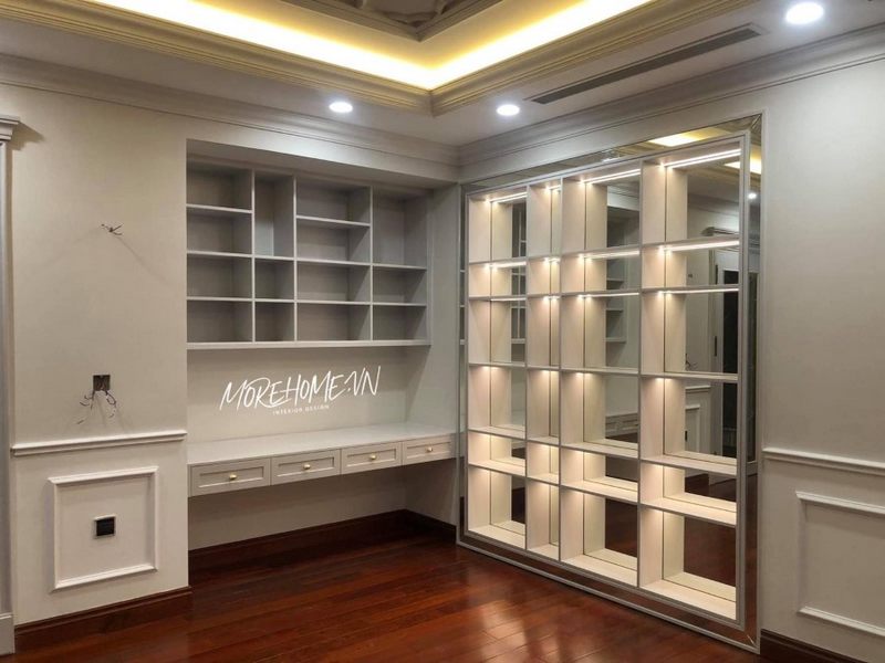 Morehome đã thực hiện công việc lắp đặt một sản phẩm kệ trang trí phòng khách bằng gỗ sơn trắng với ốp kính sang trọng.