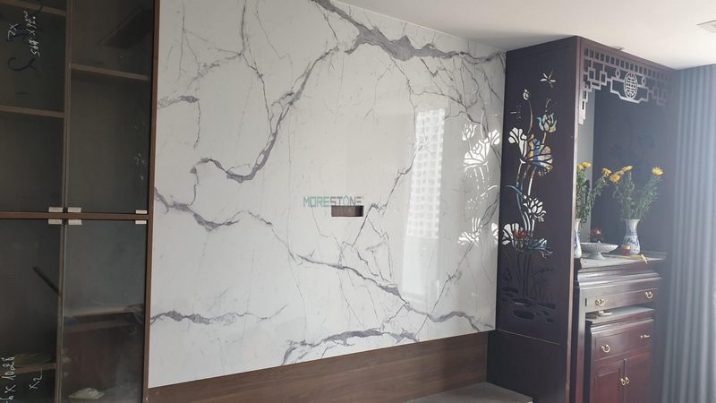 Điểm nhấn của phòng khách chung cư được thể hiện tinh tế qua việc bố trí mẫu đá ốp tường màu trắng có những đường vân mây tự nhiên, đẹp sáng bóng, trẻ trung.