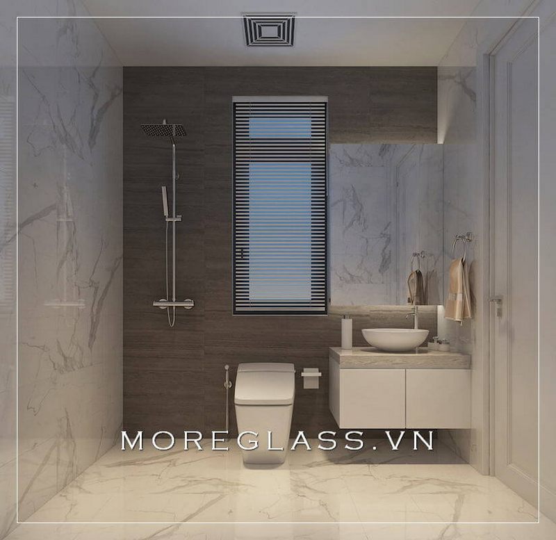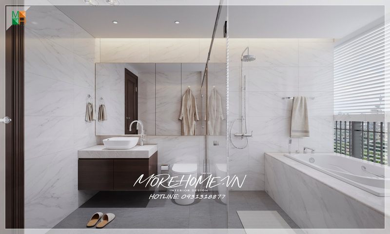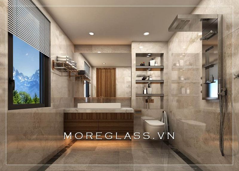 Xét về thiết kế không gian mở và thông thoáng, phòng tắm không chỉ trở nên rộng rãi hơn mà còn tạo cảm giác thư giãn và thoải mái cho người sử dụng. Việc sử dụng kính cường lực trong việc chia phòng hoặc tạo vách ngăn cho phòng tắm không những tiết kiệm diện tích mà còn giúp ánh sáng tự nhiên hiện hữu ở mọi góc độ của phòng tắm. Không gian mở cũng tạo điều kiện thuận lợi cho việc thiết kế và bố trí các vật dụng trong phòng tắm, từ kệ đựng đồ, giá treo khăn đến bồn tắm hay vòi sen.
