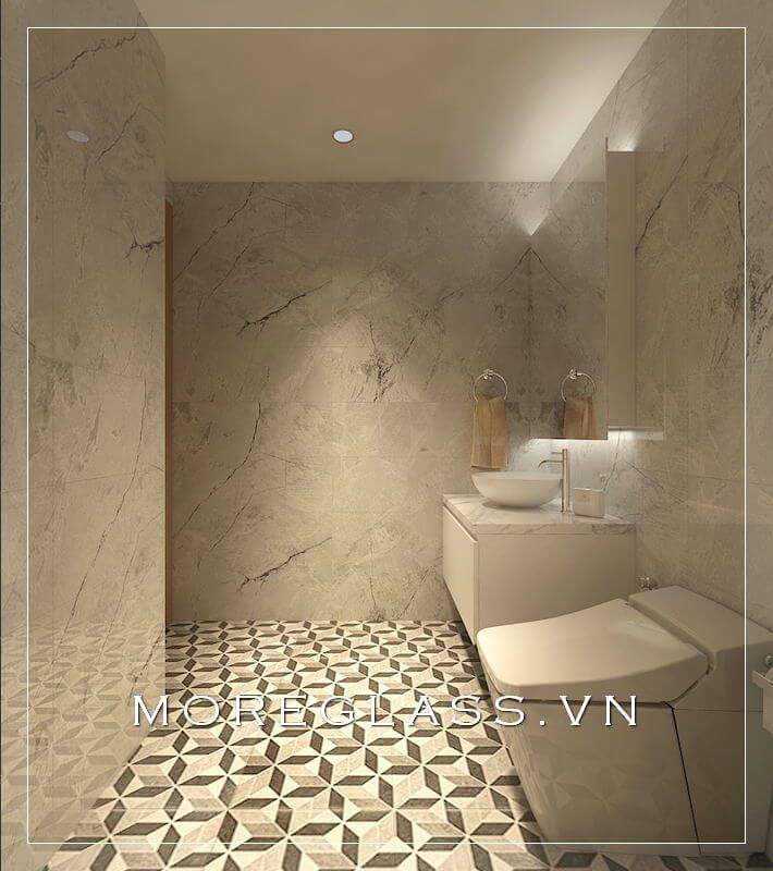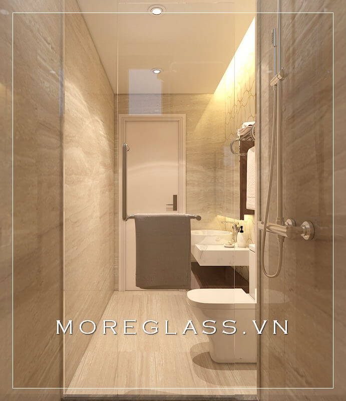 Sử dụng đá tự nhiên cao cấp, ốp nền và tường kết hợp với vách kính tắm cường lực, chúng tôi sẽ tạo ra một không gian hoàn hảo trong từng chi tiết cho mẫu thiết kế phòng tắm đẹp của bạn và phân cách hai không gian nhà vệ sinh và phòng tắm.